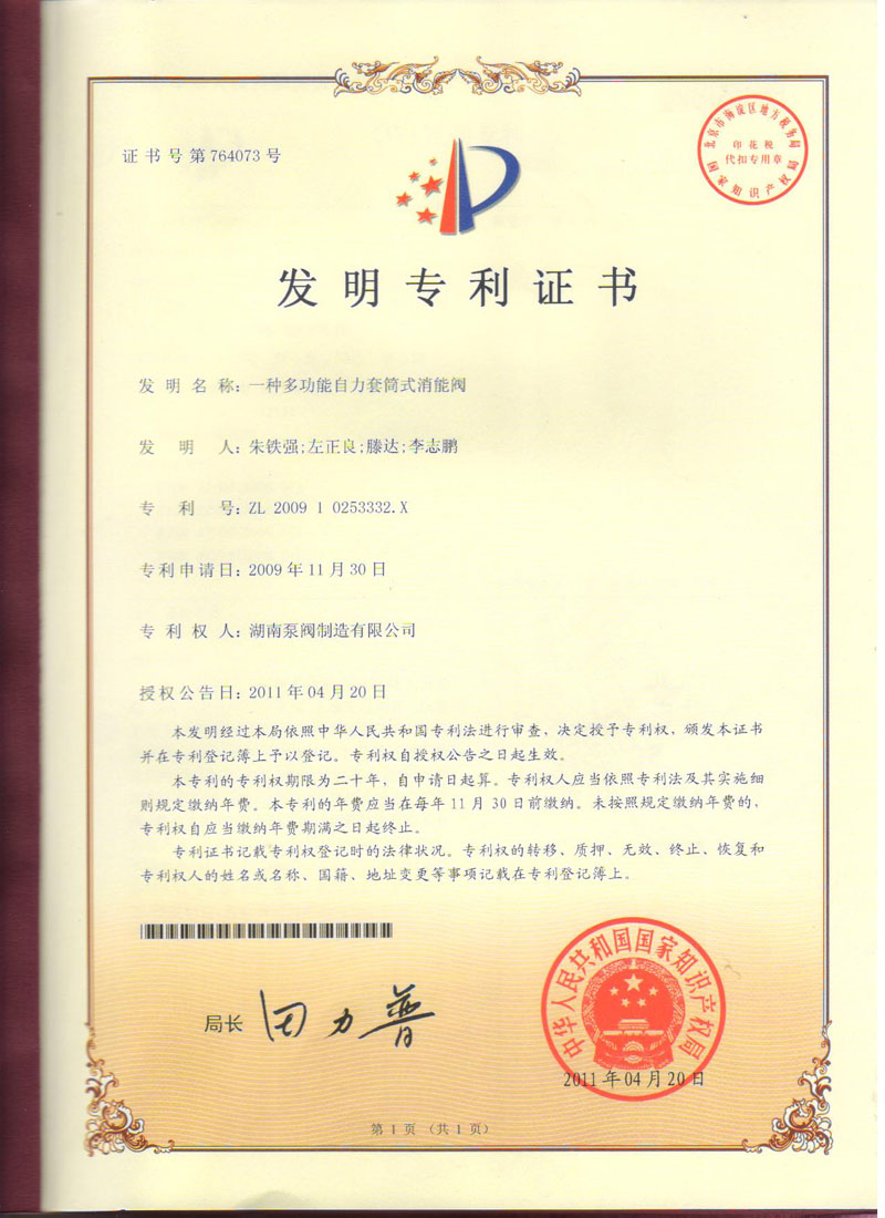 (双向自密封阀)(发明专利证书)专利号:ZL 2016 1 1232241.4