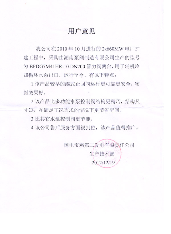 阜康工业园旋球阀用户使用意见书 东莞市松山湖天地环科税务公司管力阀 国电宝鸡第二发电有限公司用户意见