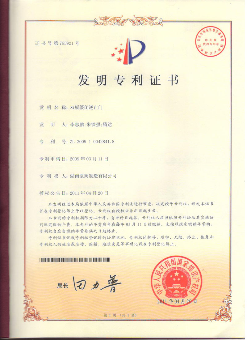 (双向自密封阀)(发明专利证书)专利号:ZL 2016 1 1232241.4
